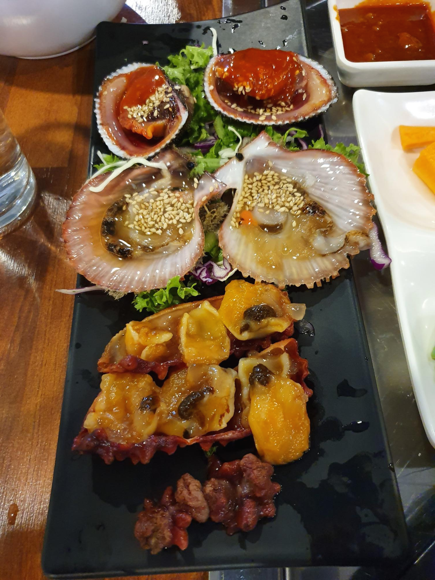 회가 나오기 전에 나오는 조개와 해삼이다. 윤기가 좔좔 흐른다. 졸깃한 식감이 좋다.