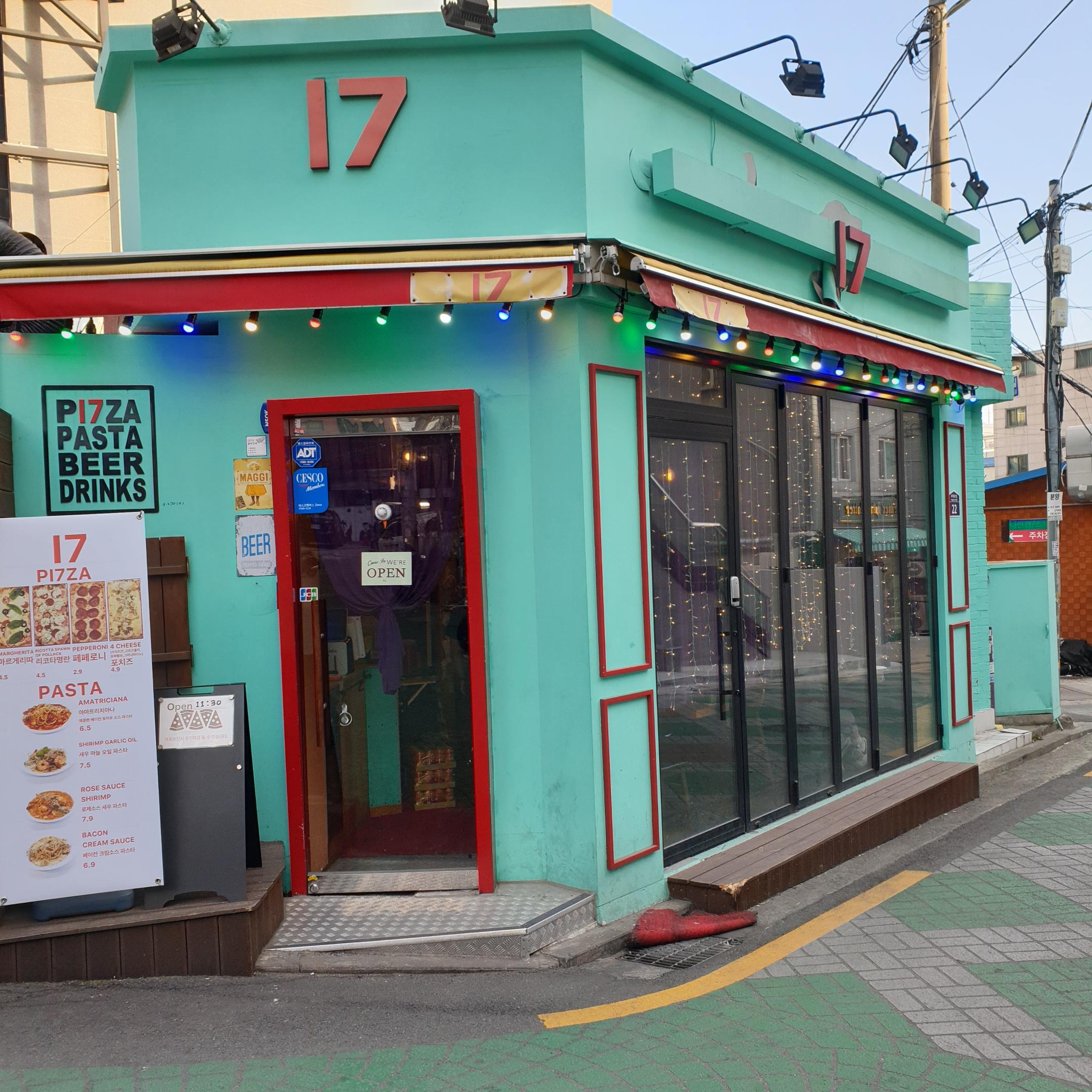 17 피자집의 대문앞에 걸린 메뉴판입니다. 생각보다 너무 저렴해서 놀랐습니다. 가성비가 좋은 곳이라더니 명불허전이군요.