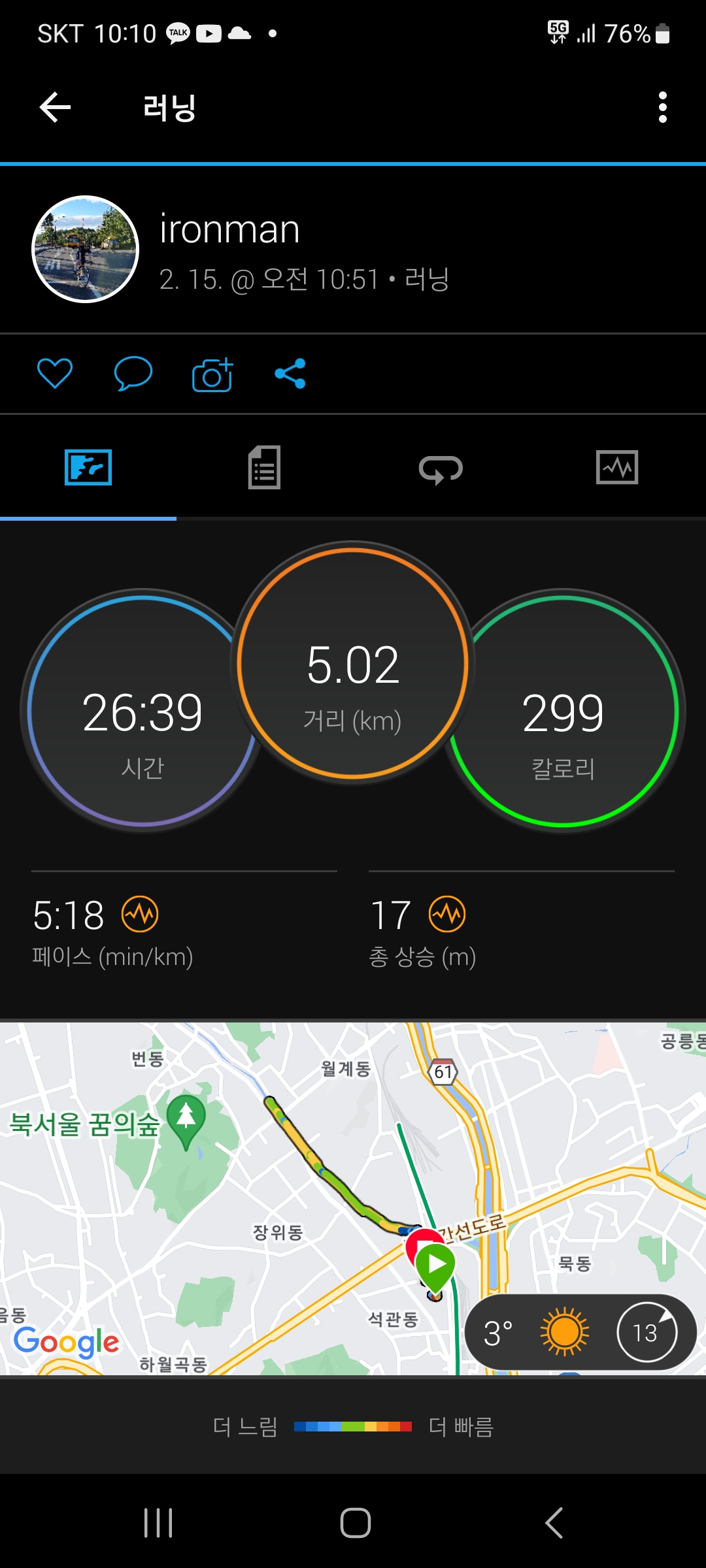 영상 3도의 온도. 적당히 달릴만했다. 우이천 따라 달렸고, 몸이 가벼워 좀 속도를 올려봤다.